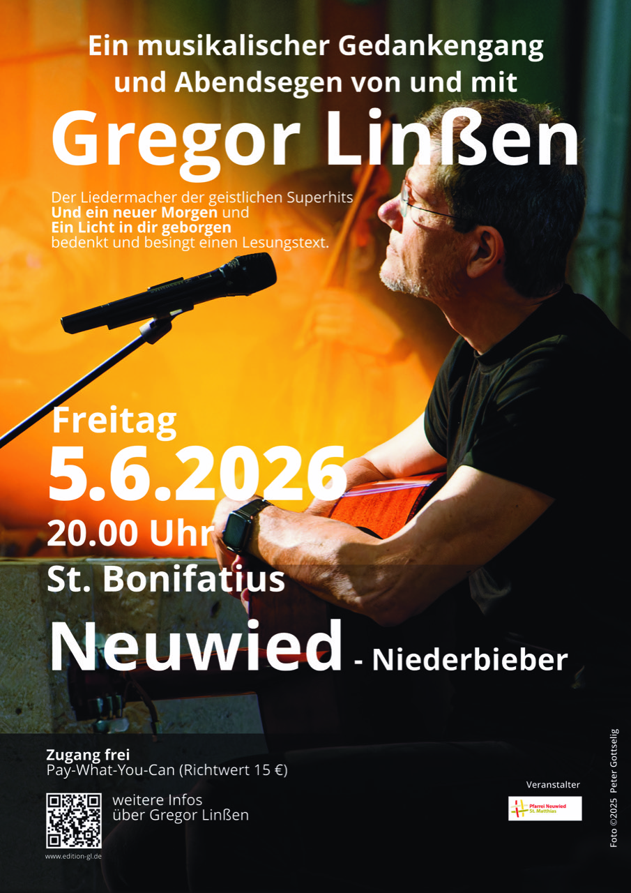 Bonifatiuskirche Niederbieber Kurt-Schumacher-Str., Neuwied, DeutschlandEin musikalischer Gedankengang von und mit Gregor Linßen Zugang frei - Pay what you can (Richtwert 15 Euro) kath. Kirche St. Bonifatius, Neuwied-Niederbieber