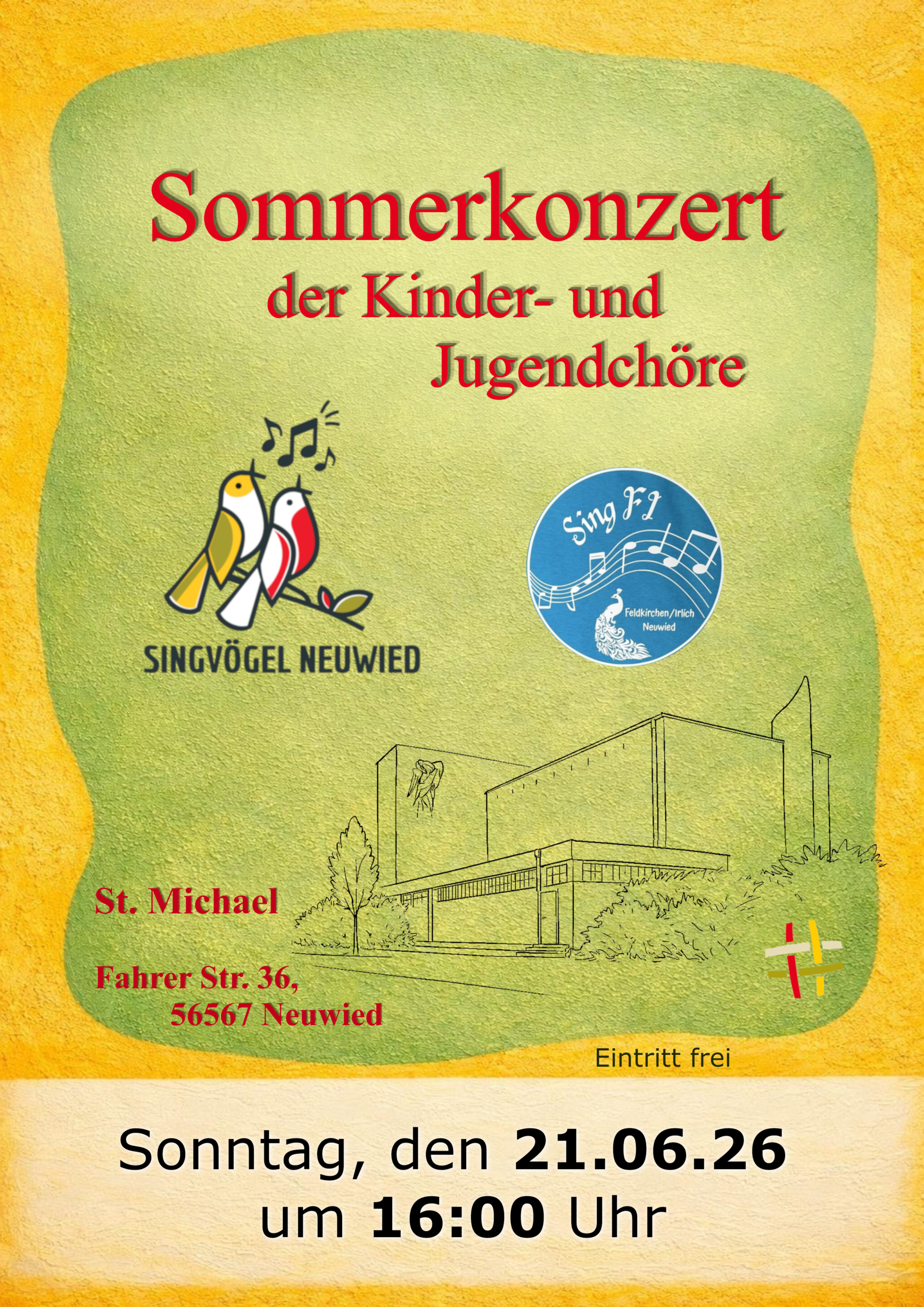 St. Michael, Feldkirchen Fahrer Str., 56567 Neuwied, DeutschlandBunt, fröhlich und voller Musik: Am 21. Juni 2026 um 16:00 Uhr laden die Kinder- und Jugendchöre der Pfarrei St. Matthias Neuwied zu einem sommerlichen Konzert in die Kirche St. Michael in Feldkirchen ein.